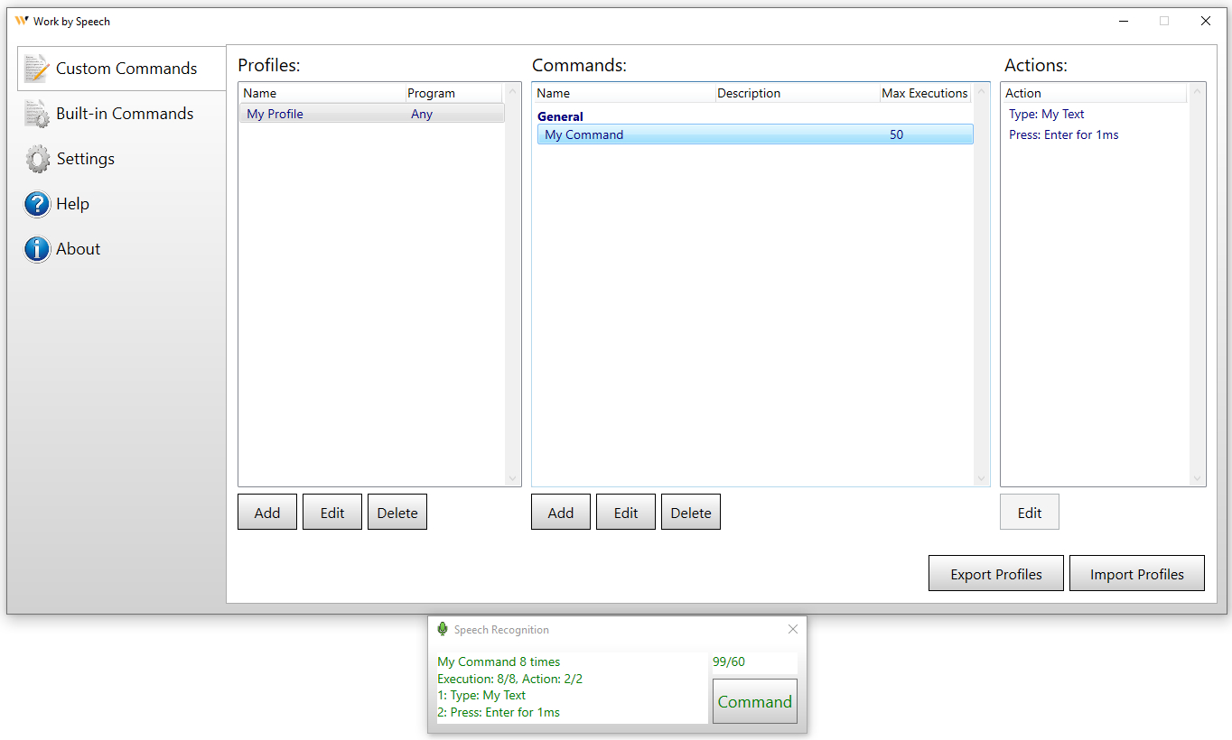 Work by Speech is the first program in the world that allows efficient work on a computer by speech without needing a keyboard and mouse.