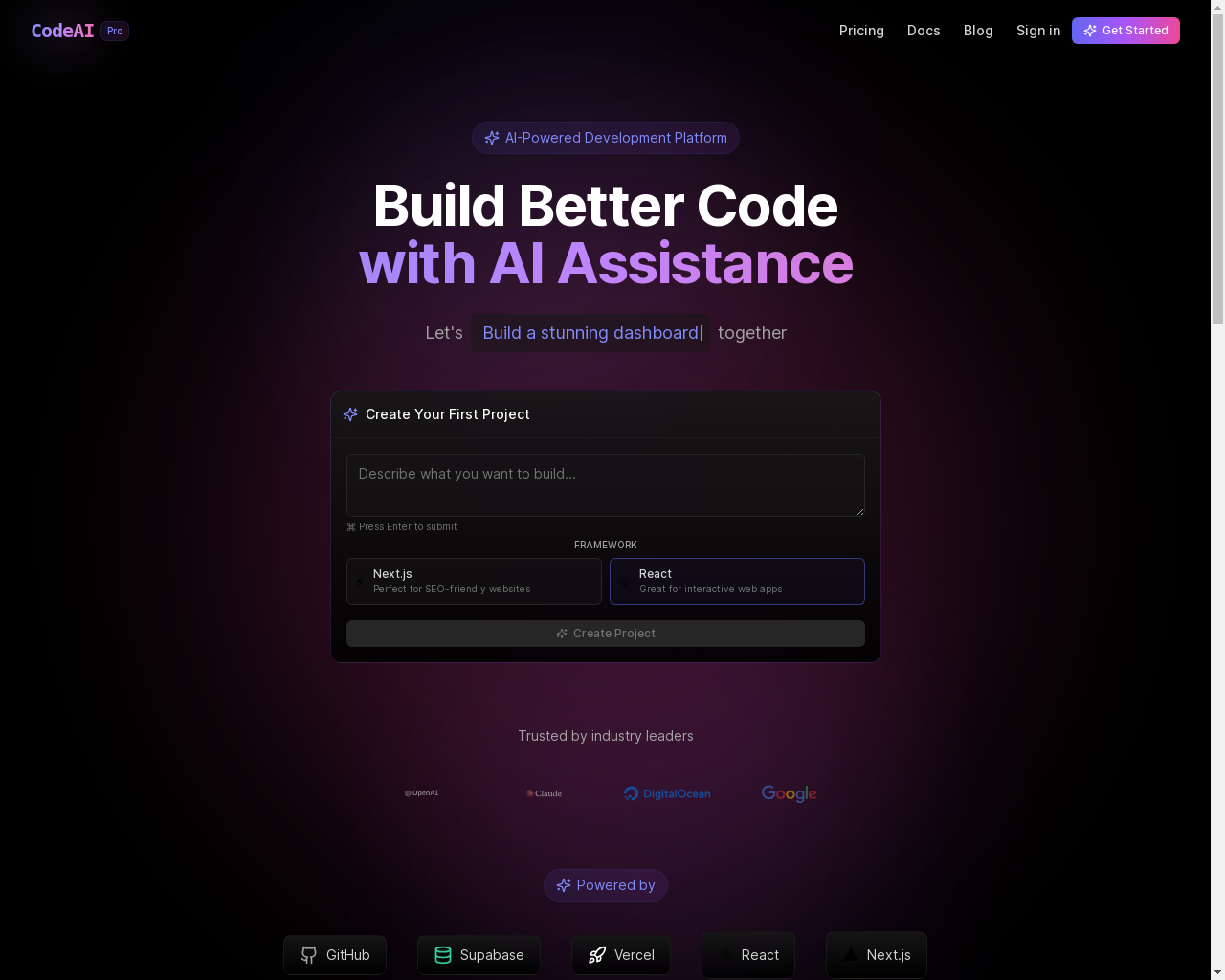 CodeAI Studio Pro is an AI-driven platform designed to streamline full-stack application development. It caters to modern developers by supporting technologies such as React, Next.js, Vue, Nuxt, Express, and Node.js, effectively accelerating the processes of prototyping, coding, and deploying applications. Key features of this platform include AI-assisted code generation and debugging, one-click deployment via Vercel, seamless CI/CD workflows through native GitHub integration, and versatile framework support for both frontend and backend applications. Additionally, it offers real-time performance monitoring, enabling developers to transition from conceptualization to production swiftly without the hassle of switching contexts or using multiple tools.