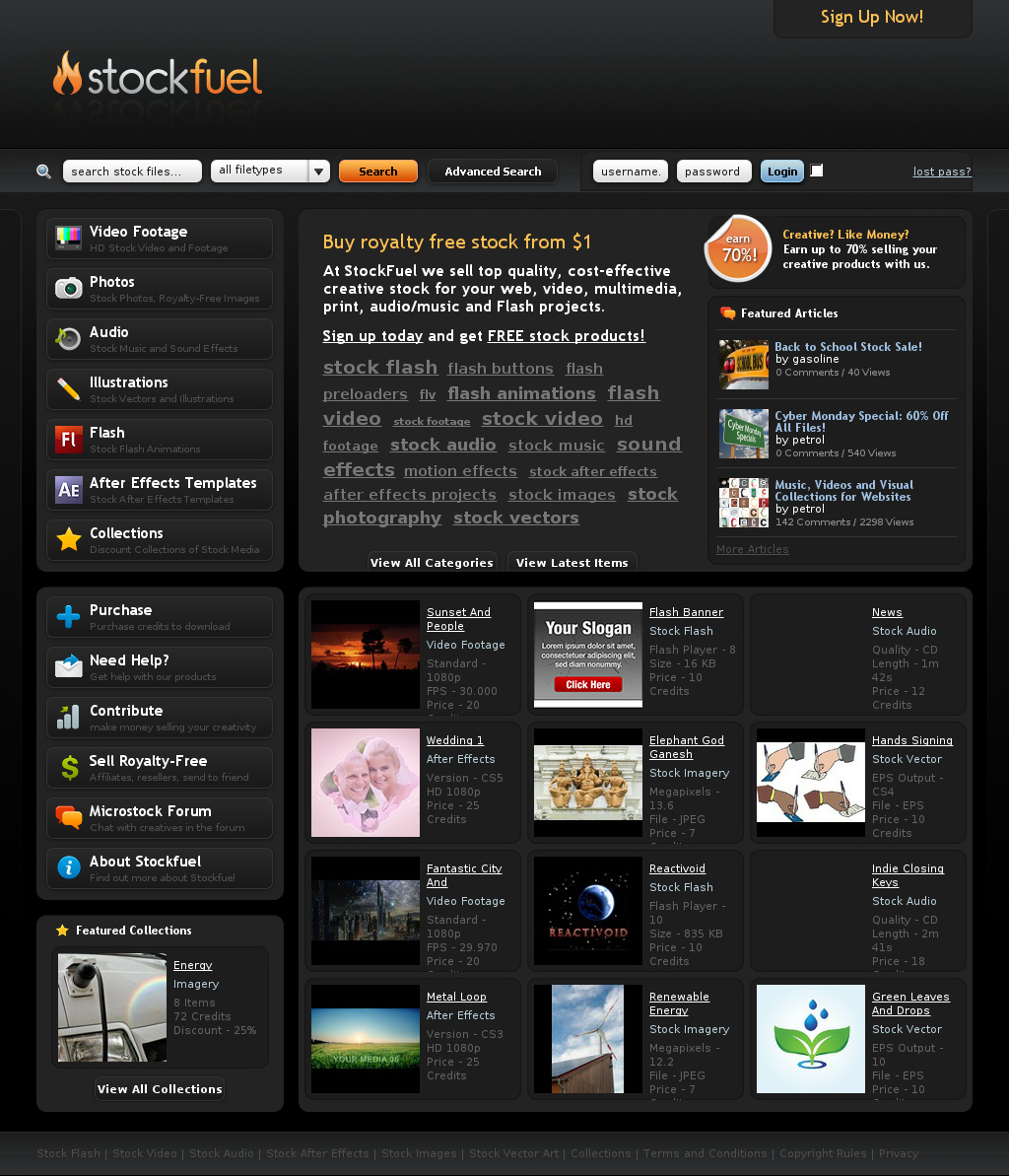 StockFuel is a creative stock platform that offers a rapidly expanding library of quality products, boasting nearly 4,000 members and over 130,000 products with continuous daily uploads from global contributors. The platform is designed with a custom interface and sophisticated backend on a LAMP stack, with extensive automation processes. These automations include generating thumbnails and watermarked demo files for videos, and producing MP3 previews and watermarked audio files for audio uploads.